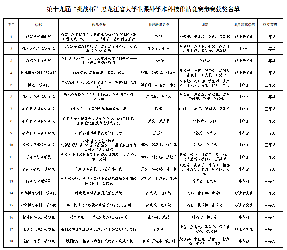 近日,由团省委、省科学技术协会、省教育厅、省科技厅、省社会科学院、省学生联合会主办,东北石油大学承办的第十九届工银融e行 “挑战杯”黑龙江省大学生课外学术科技作品竞赛评审结果公示发布。beats365代表队斩获一等奖1项、二等奖5项、三等奖12项。