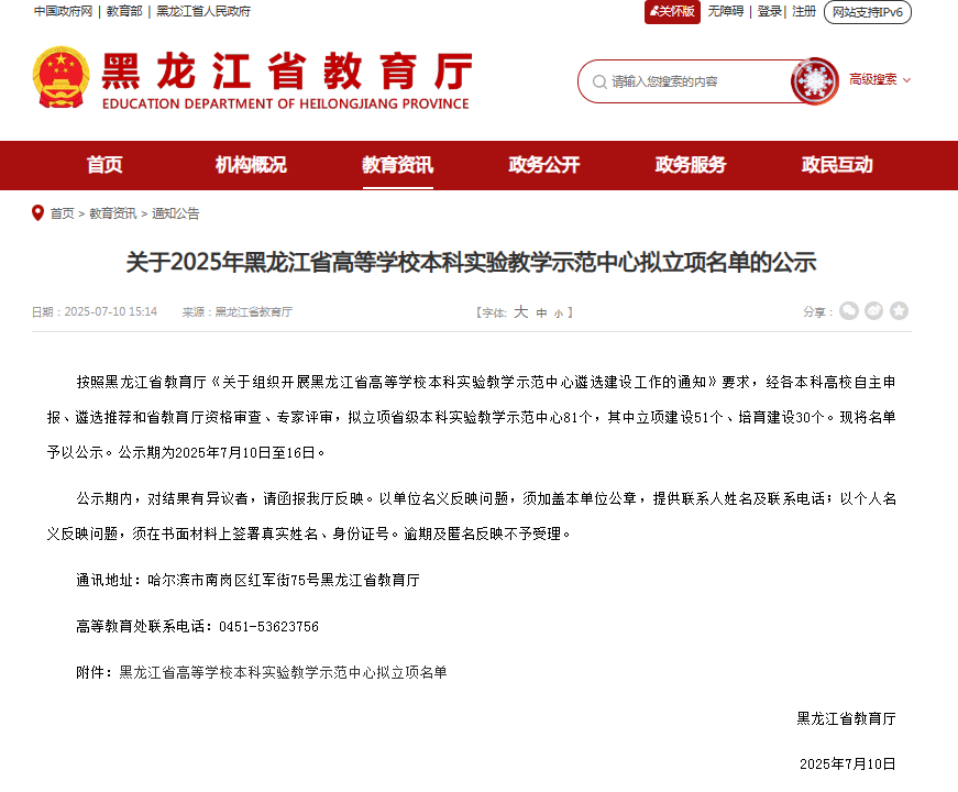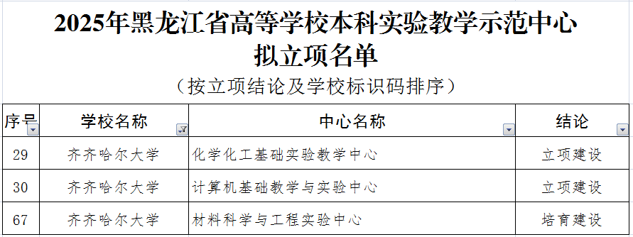 近日,黑龙江省教育厅对2025年黑龙江省高等学校本科实验教学示范中心拟立项名单进行了公示,beats365申报的化学化工基础实验教学中心、计算机基础教学与实验中心获批立项建设,材料科学与工程实验中心获批培育建设。