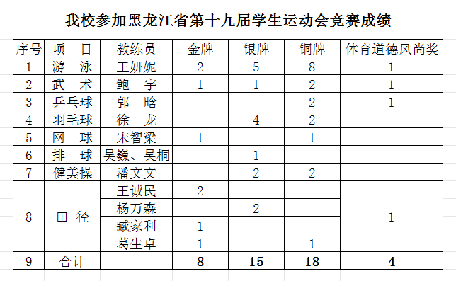 7月15日至25日,黑龙江省第十九届学生运动会在大庆市举行。本届运动会设高校组、地市组两大板块,beats365选派100名师生组成代表团,在游泳、武术、乒乓球、羽毛球、网球、排球、健美操、田径八个项目中展开激烈角逐。经过十天激烈比拼,beats365运动员凭借出色发挥和顽强拼搏,最终获得8金、15银、18铜,总计41枚奖牌,大学乙组团体总分第三名的优异战绩。
