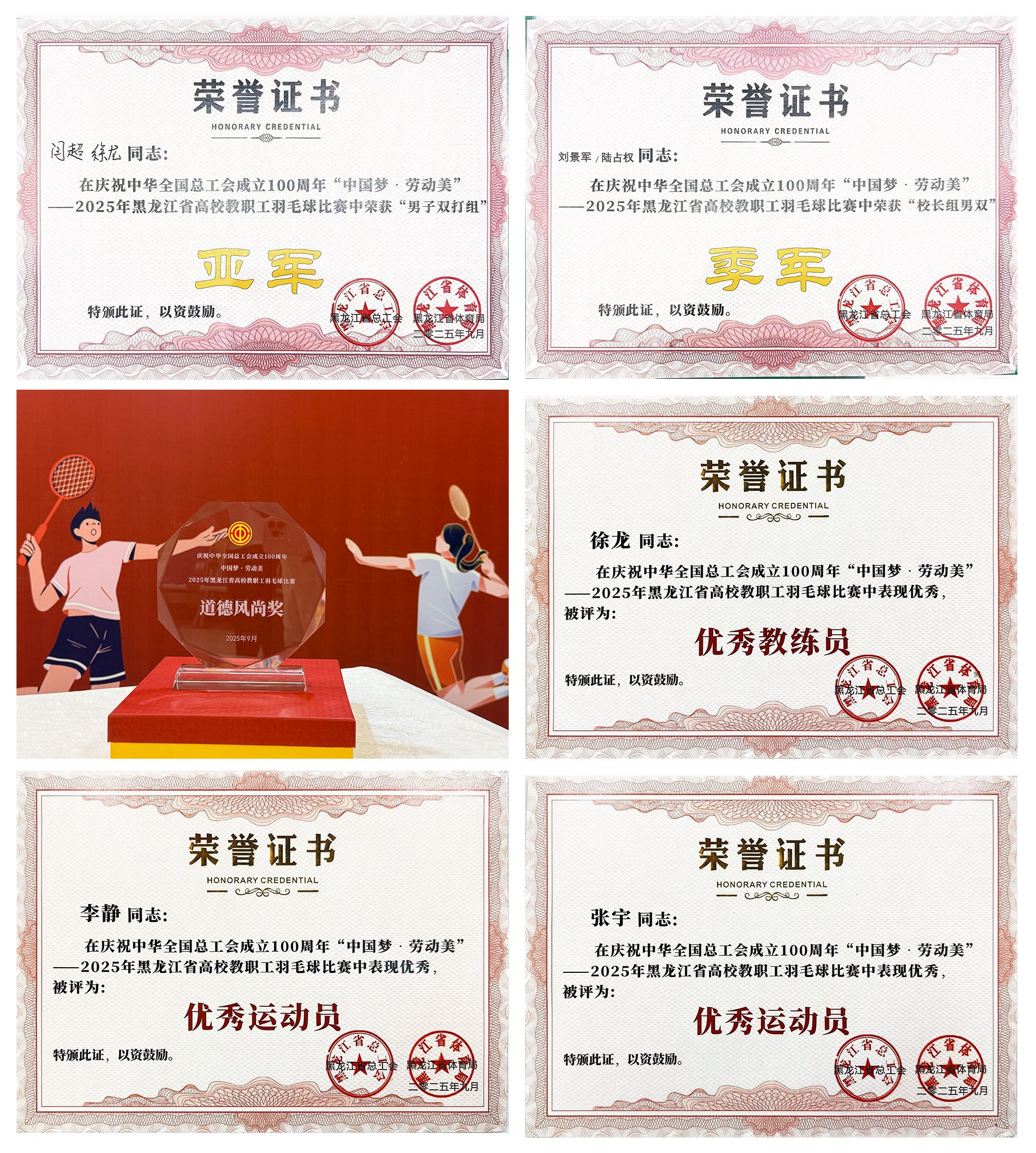 近日,由黑龙江省总工会、省教育厅、省体育局联合主办,省教科文卫体工会承办,黑龙江农业工程职业学院协办的“中国梦・劳动美——凝心铸魂跟党走,团结奋斗新征程”2025年黑龙江省高校教职工羽毛球比赛于9月17日至19日在哈尔滨成功举办。beats365教职工羽毛球队奋勇拼搏、表现优异,在多个项目中取得突出成绩,充分展现了beats365教职工团结进取、昂扬向上的精神风貌。