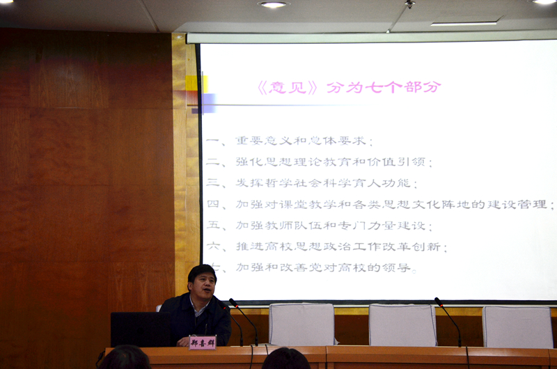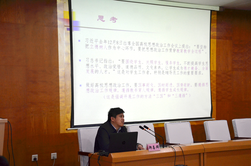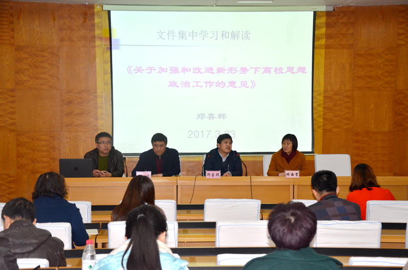 郑喜群就中共中央、国务院印发的《关于加强和改进新形势下高校思想政治工作的意见》中与学生工作紧密相关的内容向与会同志进行了传达和解读。他表示,习总书记在点评“95后”大学生时指出:“他们朝气蓬勃、好学上进、视野宽广、开放自信,是可爱、可信、可为的一代。”这就要求我们做好思想政治工作,必须要充分了解我们的学生是什么样的、他们在想什么、关注什么、希望什么。他强调,做好高校思想政治工作,必须要坚持“立德树人”根本原则,开展工作要因事而化、因时而进、因势而新;必须要遵循思想政治工作规律,遵循教书育人规律,遵循学生成长规律;必须要树立“围绕学生、关照学生、服务学生”的新理念。