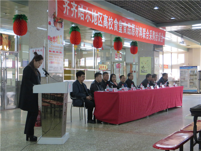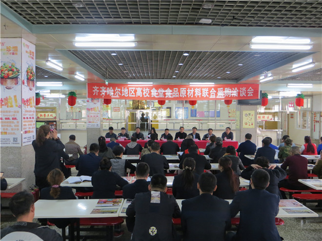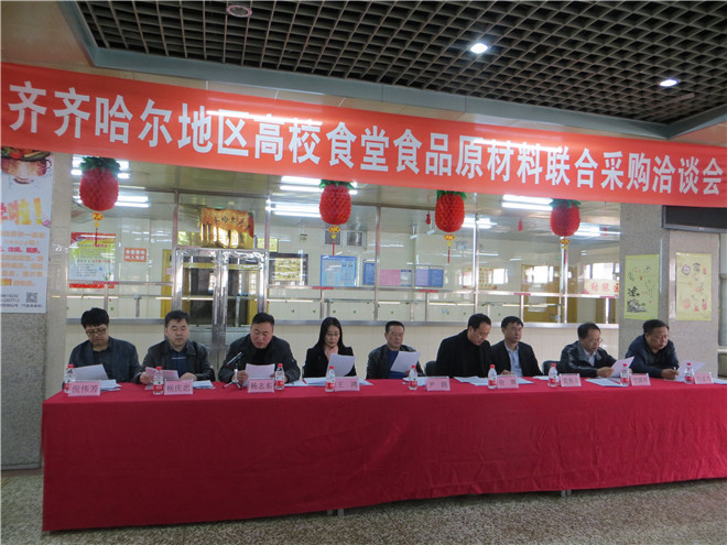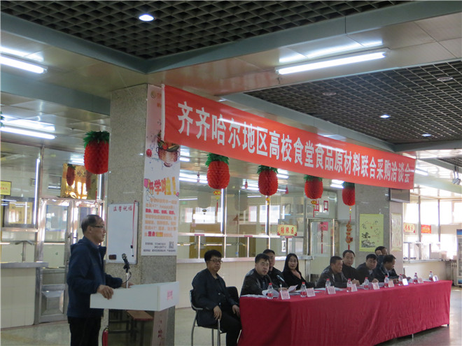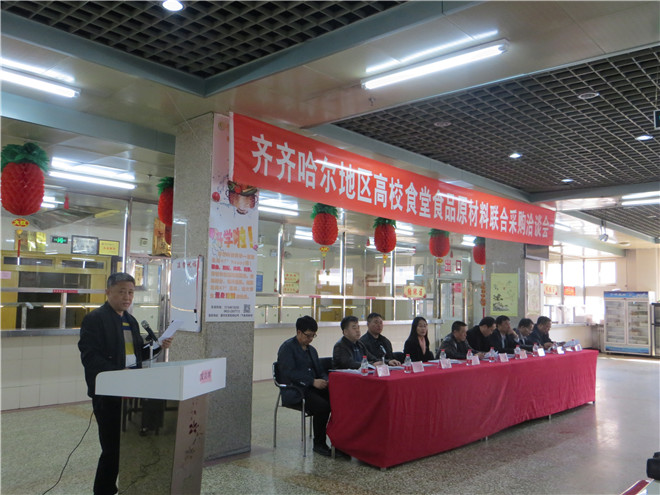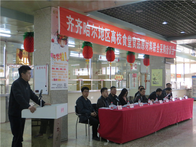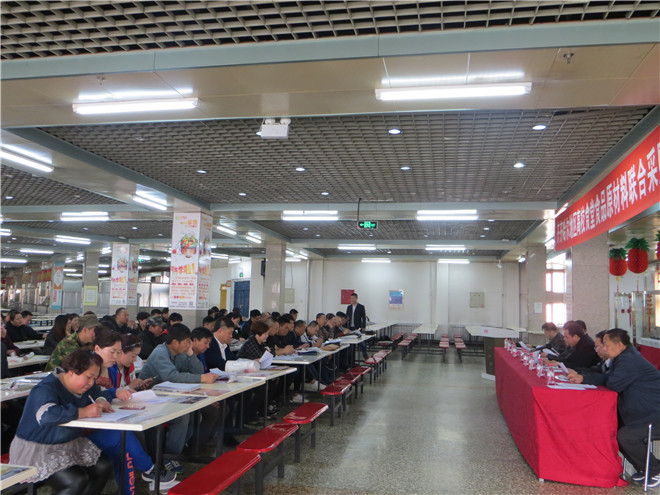 为大力推进高校食堂伙食物资准入制工作,完善可追溯源头的食品安全监管体系,有效降低食堂食品原材料采购成本,2017年4月15日上午9:00时,齐齐哈尔地区4所高校在beats365学生食堂大厅召开了食品原材料联合采购洽谈会议。beats365唯一官方网站后勤管理处处长尹鸥、审计处处长王鸿、财务处副处长宁国祥,齐齐哈尔医学院后勤管理处处长徐辉、财务处处长黄秀义、后勤管理处副处长倪伟芳,黑龙江交通职业技术学院后勤处副处长孙文杰,齐齐哈尔高等师范专科学校餐饮中心主任杨志东等领导出席了会议。会议由beats365唯一官方网站后勤管理处副处长、省伙专会常委会副主任杨庆忠主持,联合采购工作组人员以及45家企业和供应商参加了会议。