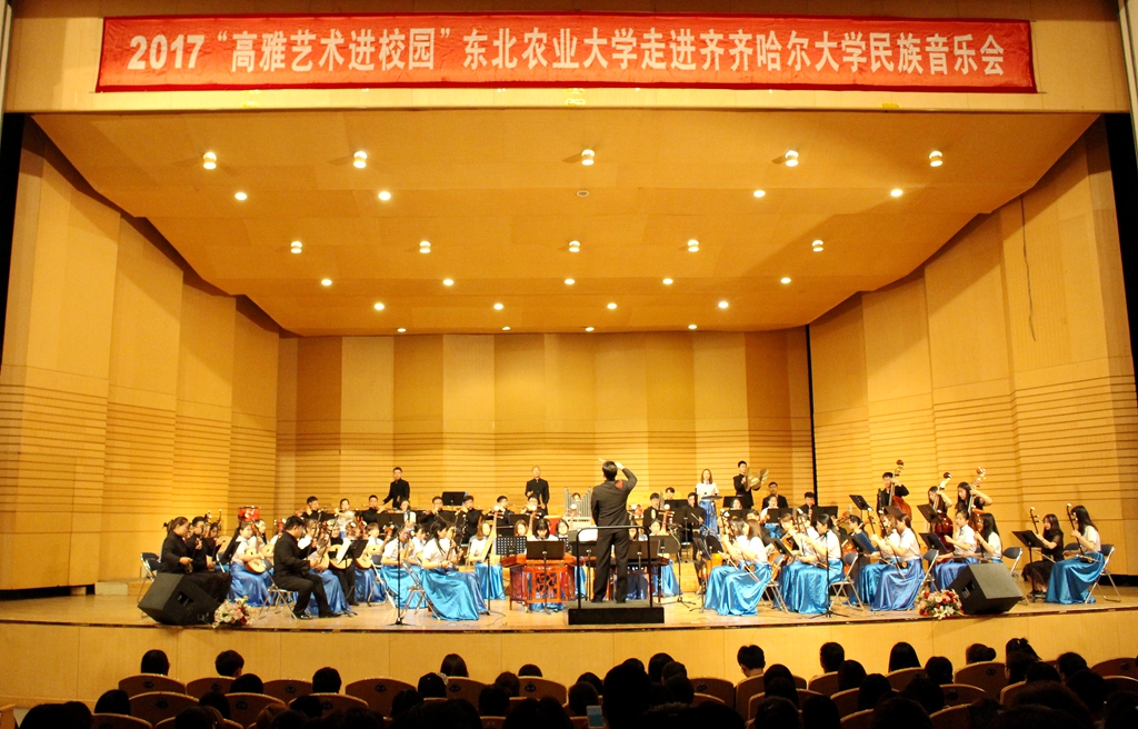 本次音乐会由东北农业大学青年民族管弦乐团编排了10个优秀的民乐及民歌节目。由省优秀青年指挥王守宽指挥的《关东序曲》、《大漠孤烟直》拉开了演出序幕,熟悉的旋律、精湛的演绎瞬间点燃了全场的热情。扬琴重奏《Smooth Criminal》、中阮独奏《云南回忆第一乐章》、古筝重奏《沙漠玫瑰》、竹笛重奏《跑旱船》等一系列经典乐曲的演奏,赢得了在场观众的阵阵掌声;项多、珊丹带来的高水准的女声独唱《我爱我的祖国》、《送给妈妈的茉莉花》等曲目的演唱把台下观众的热情一次又一次点燃;民族管弦乐合奏《丰年祭》悠扬婉转、一气呵成,气势磅礴的《射雕英雄传》把现场气氛推向高潮,赢得在场观众雷鸣般的掌声。在场师生们沉浸在美妙的乐声中,久久回味。