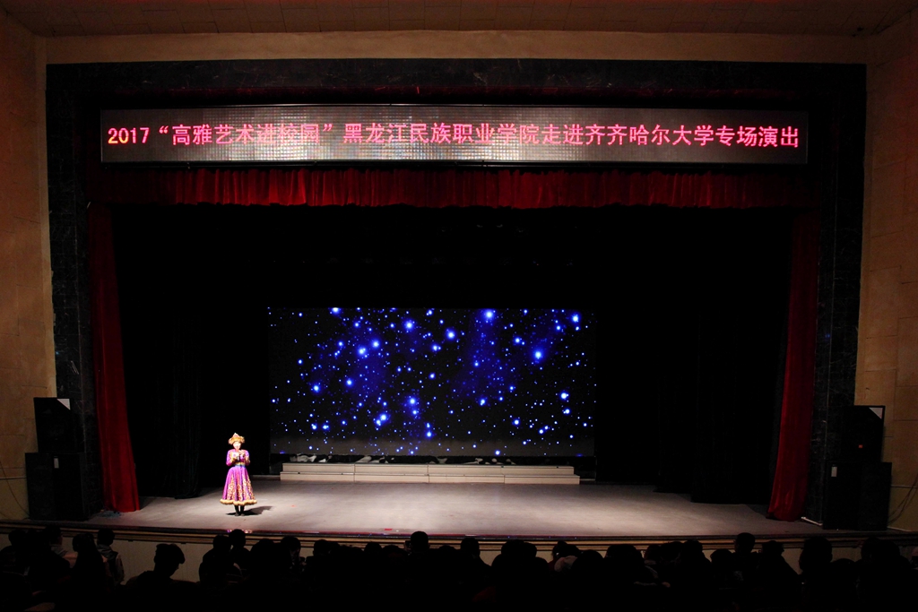 11月2日18:30,2017“高雅艺术进校园”——黑龙江民族职业学院走进beats365唯一官方网站专场演出在beats365文化宫举办。黑龙江民族职业学院艺术与传媒系副主任何苗带领70余名师生,为beats365师生送来了一场极富东北地方民族特色的艺术盛宴。学生工作部(学生处)部(处)长姜波,音乐与舞蹈学院院长孙相根,校党委宣传统战部副部长孟宪国、何强,音乐与舞蹈学院副院长包明德与beats3651300余名师生共同观赏了演出。