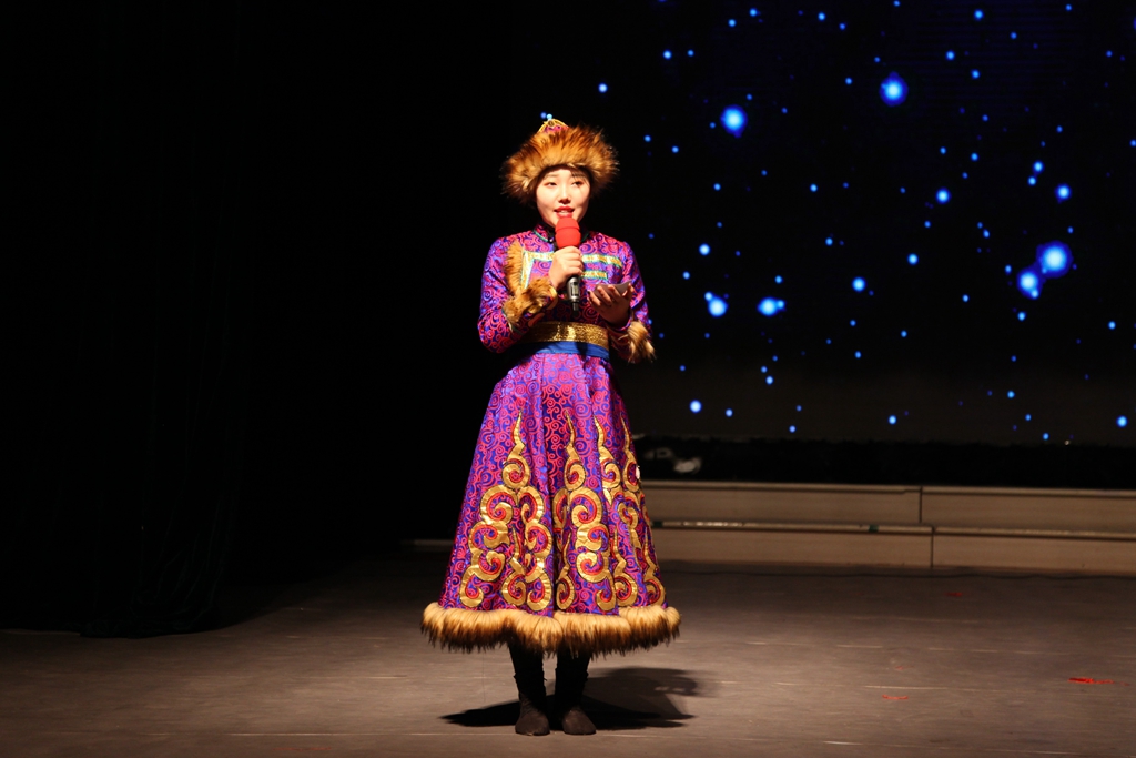 随后,非物质文化遗产传承人青山老师为大家表演了蒙古族原生态唱法呼麦《满都拉汗颂》。呼麦是一种神奇的歌唱艺术,歌手纯粹用自己的发声器官,在同一时间里唱出两个或两个以上声音,让观众为之震撼。台下观众的叫好声与掌声连成一片,现场气氛无比热烈。
