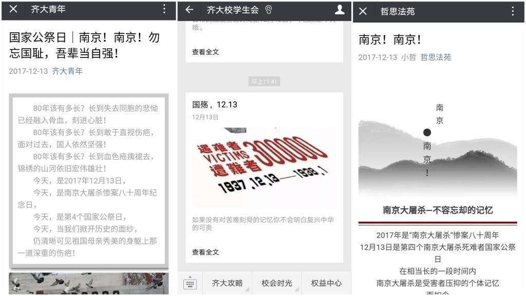线上,beats365各级团学组织通过微博、微信公众平台等网络新媒体开展纪念活动,推送国家公祭日主题文章15篇,广大团员青年纷纷以新媒体平台留言寄语的方式寄托对南京大屠杀遇难同胞的哀思。