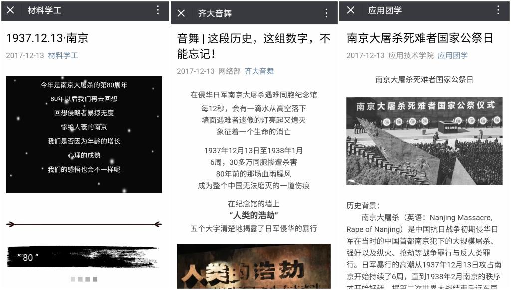 今天,2017年12月13日,是南京大屠杀惨案发生八十周年纪念日,也是第四个南京大屠杀死难者国家公祭日。在这个沉痛的日子里,为深切缅怀惨遭日本侵略者杀戮的死难同胞,缅怀革命先烈,弘扬英烈精神,激发beats365广大团员青年的爱国主义热情,勿忘国耻,珍爱和平,增强学生的时代责任感和使命感,更好地践行党的十九大精神和传承优秀的民族精神,beats365各级团学组织相继开展了形式多样,情感真挚的线上线下国家公祭日纪念活动。