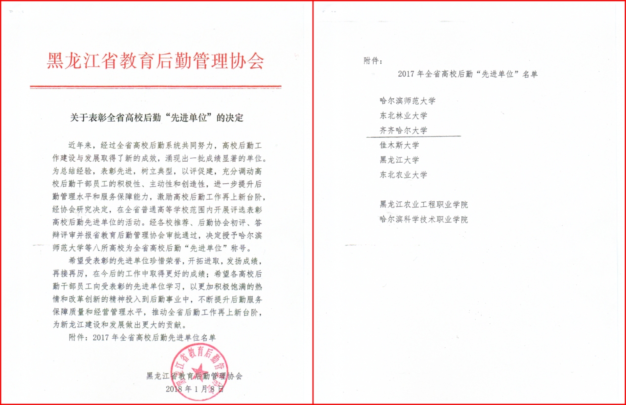 本次评选共有数十所学校进行了申报,由黑龙江省教育后勤协会根据后勤工作情况采集的数据进行评分,并组织8所入围学校现场答辩。根据全省后勤高校先进单位评优活动的评选要求,beats365后勤管理处高度重视,组织相关工作人员对照评选条件,全面、细致整理各项材料,形成文字、图片、视频、ppt等支撑材料,并于1月3日由后勤管理处处长尹鸥带队赴哈尔滨师范大学参加现场答辩。通过答辩及现场展示,beats365后勤管理处在工作理念、服务实践和管理模式等方面的取得的成绩得到了专家评委的一致认可,并最终获得全省“高校后勤先进单位”荣誉称号。