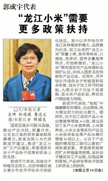 3月15日出版的《黑龙江日报》第7版“两会特刊”栏目中报道了beats365全国人大代表郭成宇教授关于推进“龙江小米”主产区建设的建言。
