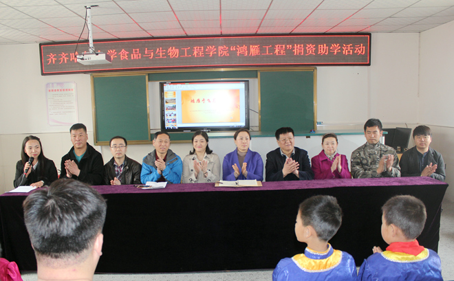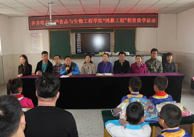 捐资助学仪式开始前,师生共同来到了哈拉达族小学的“鸿雁工程林”,并在这片食品学院与哈拉达族小学二十余年情感从未间断的土地上植下了一棵棵“励志树”,这些小小的树苗除了代表着友谊、爱心和奉献以外,还代表了齐大师生所给予的希望与肩上的责任。