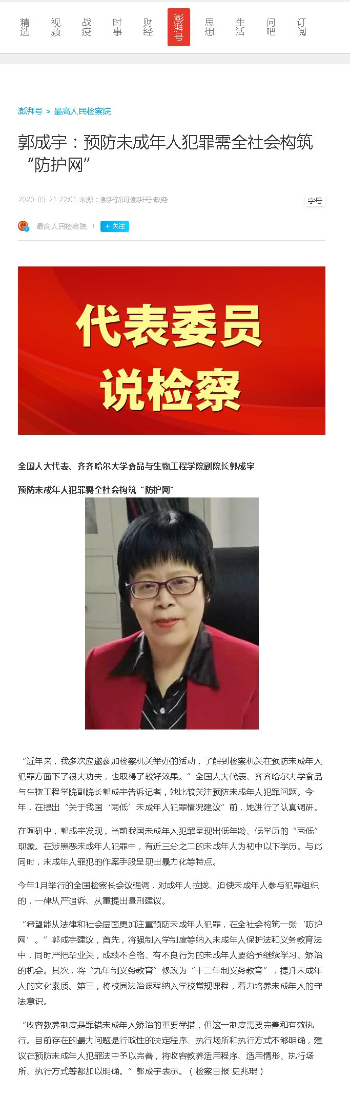 【澎湃】郭成宇:预防未成年人犯罪需全社会构筑“防护网”