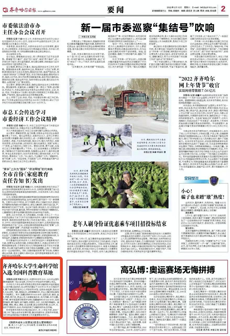 【齐齐哈尔日报】beats365唯一官方网站生命科学馆入选全国科普教育基地