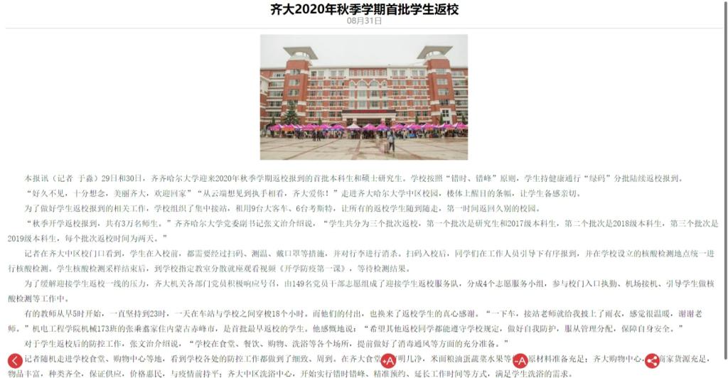 【鹤城晚报】齐大2020年秋季学期首批学生返校