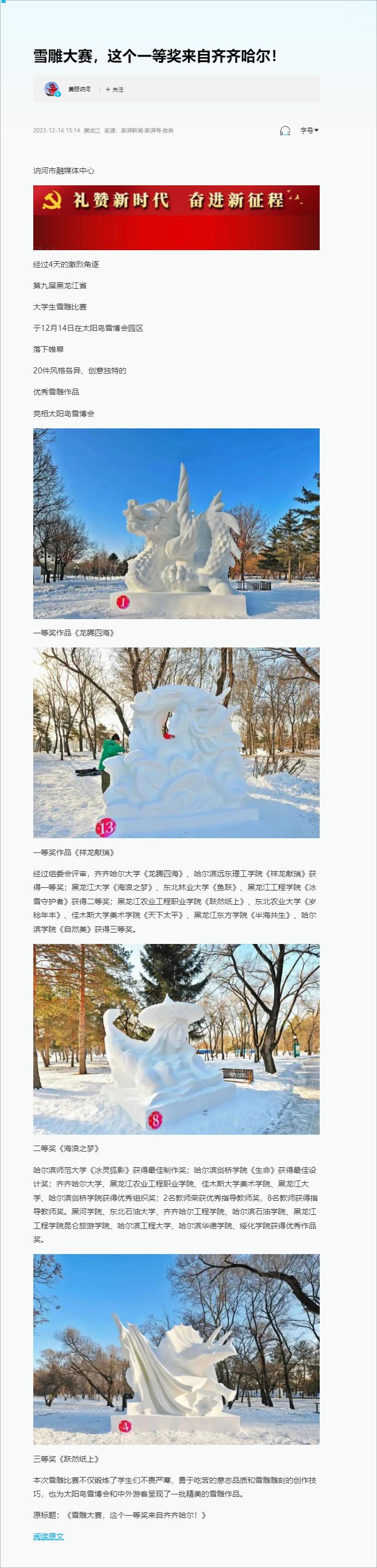 【生活报】《龙腾四海》《祥龙献瑞》夺冠!第九届黑龙江省大学生雪雕比赛落幕