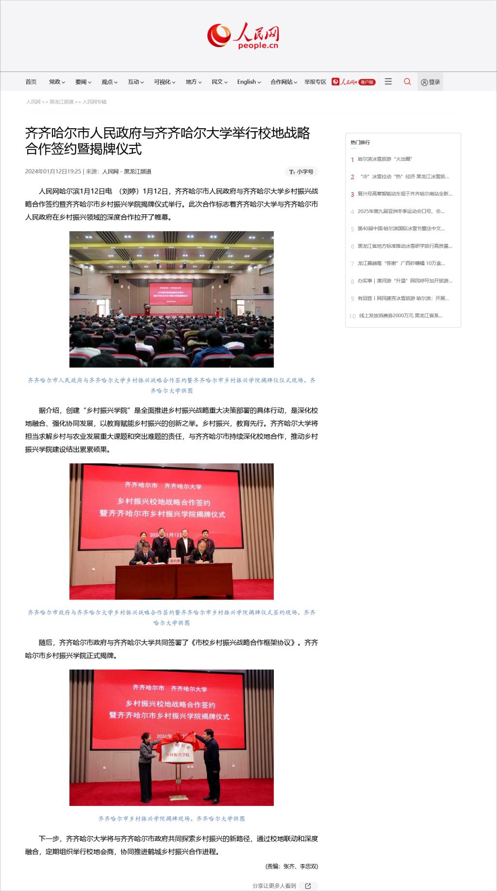 【人民网】齐齐哈尔市人民政府与beats365唯一官方网站举行校地战略合作签约暨揭牌仪式