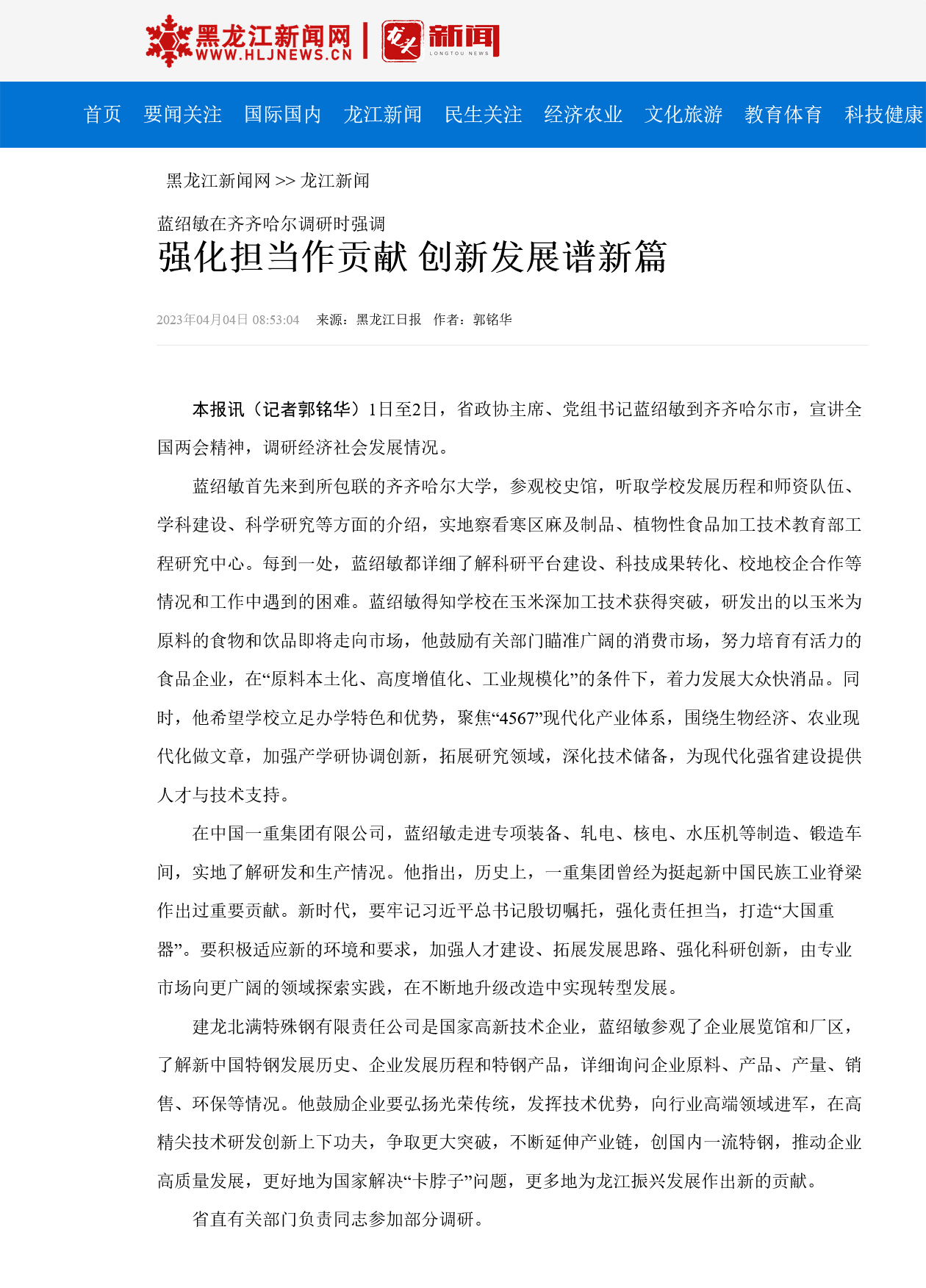 【黑龙江新闻网】蓝绍敏在齐齐哈尔调研时强调强化担当作贡献创新发展谱新篇