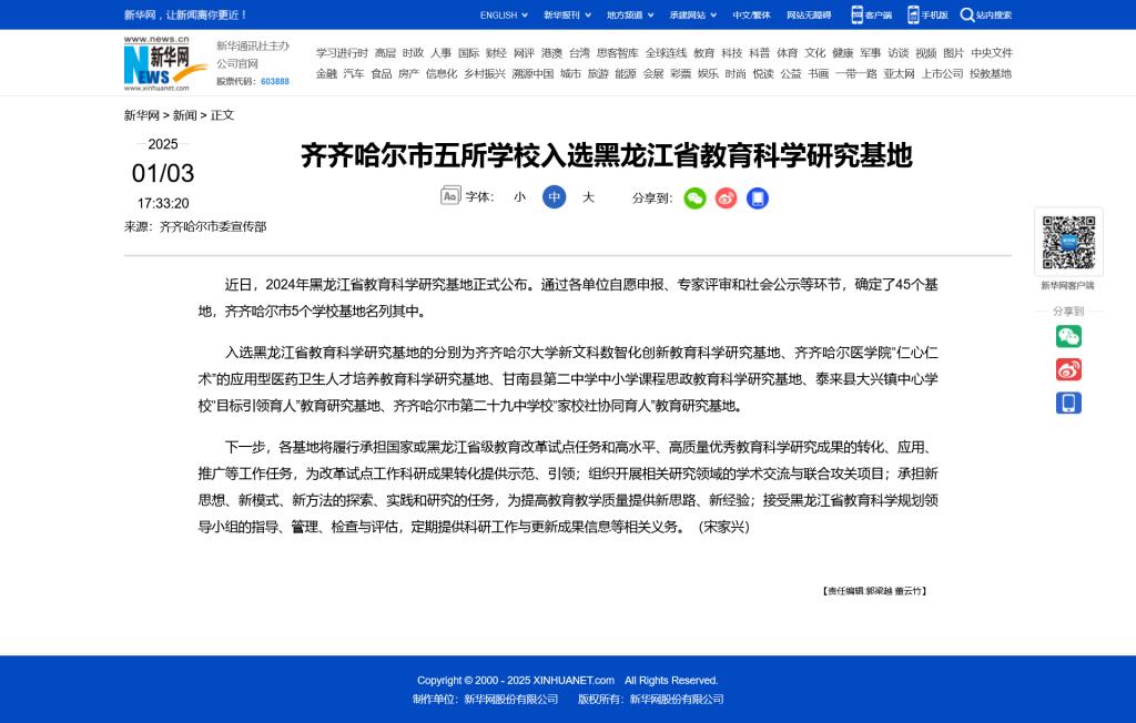【新华网】齐齐哈尔市五所学校入选黑龙江省教育科学研究基地