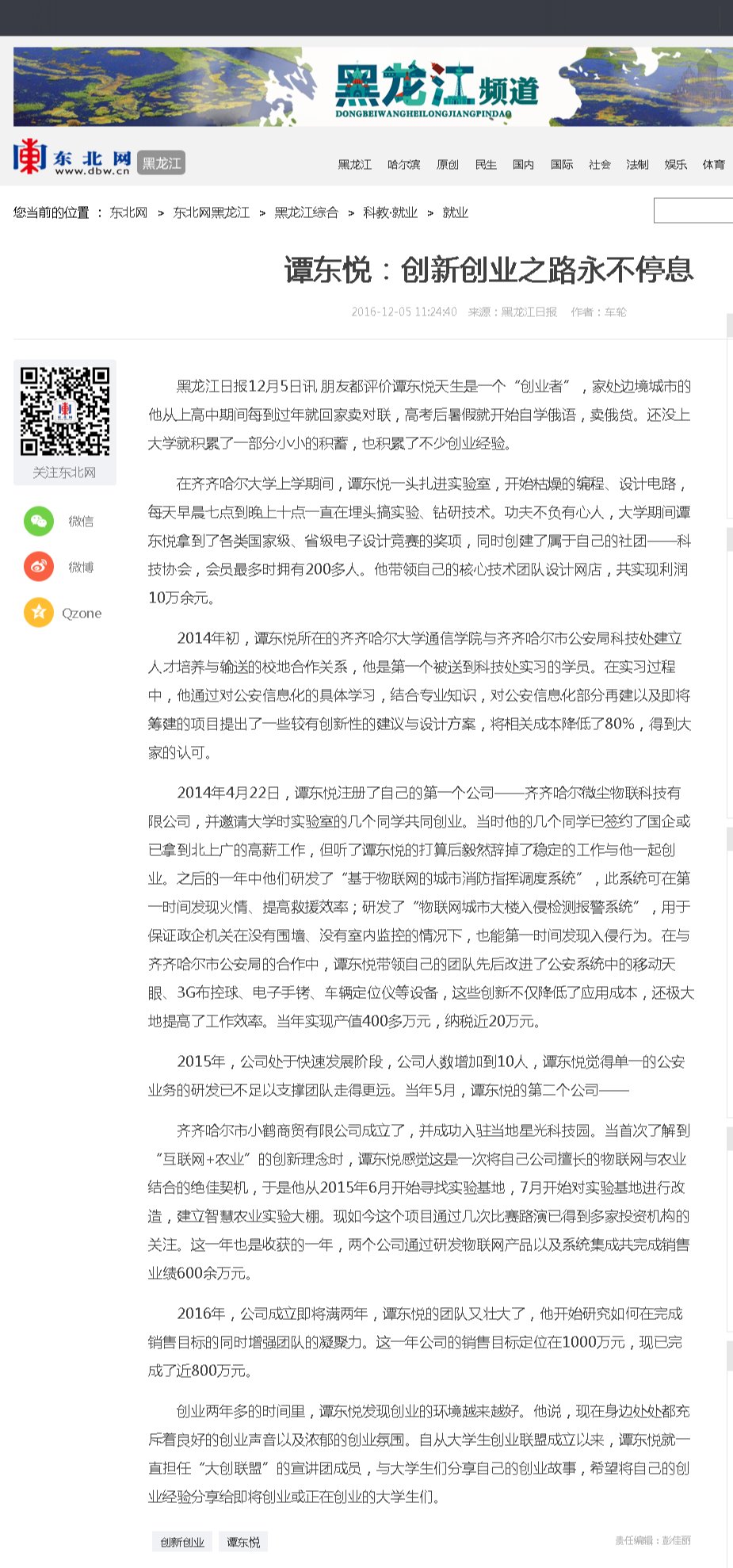 《黑龙江日报》:谭东悦:创新创业之路永不停息