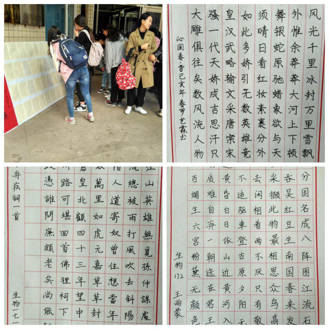 本次比赛分粉笔字组和钢笔字组,参赛选手们纷纷展示了各自书法的表现风格和书写能力。既有一气呵成、笔画遒劲、笔势生动的粉笔字书法,也有错落有致、刚柔并济的钢笔字书法。经过激烈的角逐,粉笔字组的孙佳艺、李想、白小丽,钢笔字组的韩静鑫、陈镜屹、史珊珊分别获得本次比赛各组别的一等奖。本次比赛,为学生搭建一个锻炼自己、展示风采的平台。