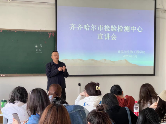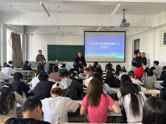 5月12日,王殿友和宁振鑫应邀请来我院召开毕业生专场招聘会。齐齐哈尔市检验检测中心隶属于齐齐哈尔市市场监督管理局,公益一类财政全额预算拨款事业单位,中心内设13个部门,检测范围包含计量、质量、食品、特种设备、标准化等领域。