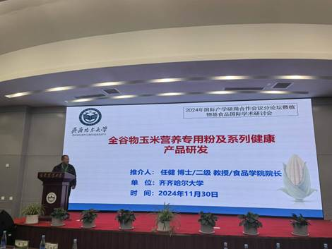 会议期间,任健院长应邀作《全谷物玉米营养专用粉及健康产品开发》为主题的学术报告。任健院长以自身科学研究领域为内容,重点介绍了我院在植物性食品加工领域取得的主要成绩,从成果技术优势、产品开发情况及科研产出等方面做了全面汇报,讲解内容引起了与会专家学者和企业人士的兴趣和好评。